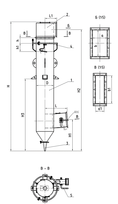 Мокрый пылеуловитель ЦВП имеет конструкцию отличную от других пылеулавливающих аппаратов, которая представлена следующими основными элементами: 1 – корпус, 2 – улитка, 3 – конус, 4 – коллектор, 5 – смывное приспособление. Конструкция циклона ЦВП представлена на чертеже общего вида.