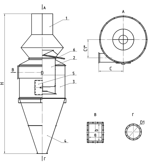 На чертеже обозначены следующие элементы: 1 – выхлопная труба (выходящий патрубок), 2 – внутренний стакан, 3 – корпус циклона, 4 – конус циклона, 5 -люк, 6 – сливной патрубок.