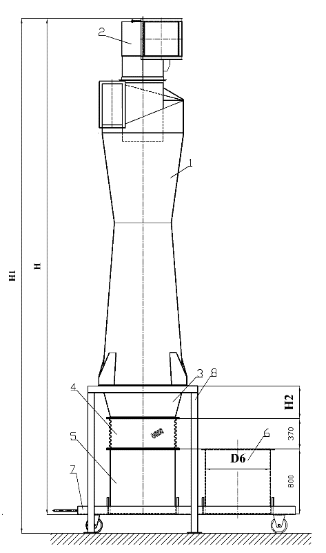 Конструкция циклона представлена на чертеже общего вида, и состоит из корпуса, входного патрубка и выхлопной трубы. Корпус состоит из двух конусных элементов развернутых друг к другу узкими частями. Верхний конус сужается к низу, из-за чего волокнистые частицы пыли, проходя через конус сцепляются вместе и образуют более крупные частицы, которые за счет увеличения своего веса легче оседают в нижней части. Нижний конус расширяется к низу, что позволяет избежать засорения выходного отверстия крупными частицами пыли.