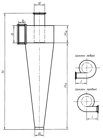 По типу вращения воздуха относительно выходящего патрубка циклоны СДК-ЦН-33 подразделяются на правосторонние (правое исполнение) и левосторонние (левое исполнение). Пример правого и левого исполнения показан на чертеже общего вида.
