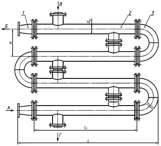Схема соединения секций подогревателя ПВСхема соединения блока-секций подогревателя ПВ в одну систему: 1 – переход; 2 – блок-секция ПВ1, 3 – калач соединительный