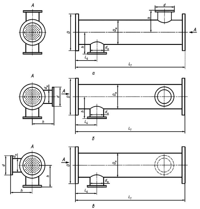 Подогреватели ГОСТ 27590-2005 - Типы исполненийТипы конструктивных исполнений патрубков: а – типовое, б – правое исполнение, в – левое исполнение